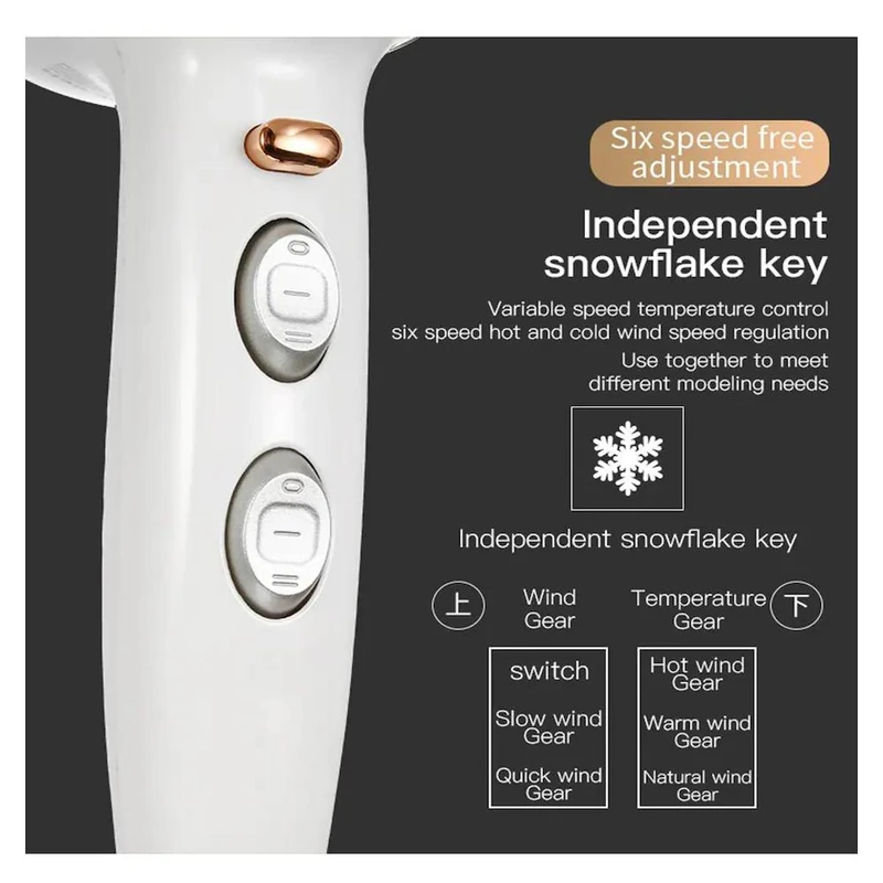 وی جی آر V-414 دارای دو سرعت متفاوت و سه حالت تنظیم دما (سرد، ملایم، گرم) است تا بتوانید متناسب با نوع و ضخامت مو، تنظیمات ایدهآل را انتخاب کنید. همچنین، کلید مجزای باد سرد به شما این امکان را میدهد که پس از حالتدهی، موها را با باد خنک تثبیت کرده و ماندگاری حالت را افزایش دهید.